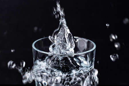 Glass of water with splashes on a dark background, studio shot