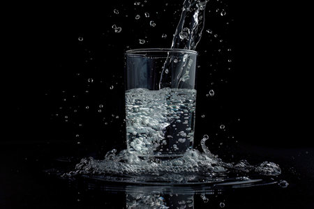 Close-up of water pouring into a glass, causing energetic splashes and creating mesmerizing ripples on a dark, glossy surface.