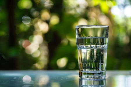 A glass of water sitting on a table with some reflections, AI