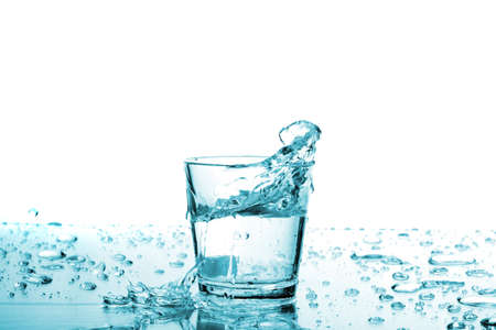 Glass of pure fresh water with splashes and drops. Splash of transparent clear water liquid in glass. Water in glass, detox, diet, thirst concept