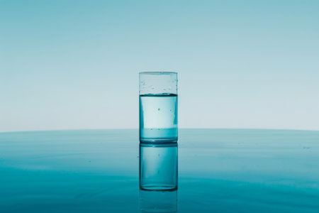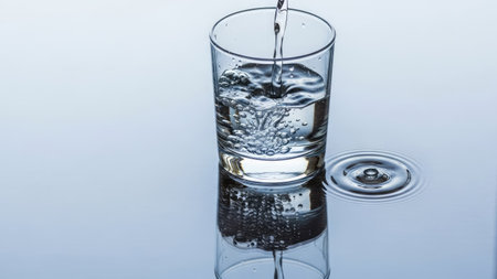 A clear glass fills with fresh water against a blue backdrop. Water droplets glisten on the table, creating a serene scene symbolizing hydration and wellness in a healthy lifestyle.