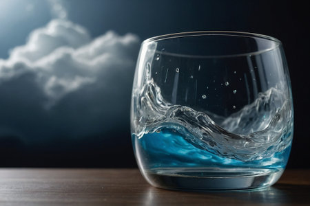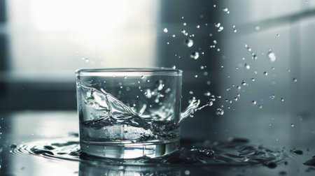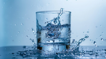 Dynamic image of water splashing in a glass, capturing the essence of freshness and fluidity. Perfect for concepts of hydration and refreshment.
