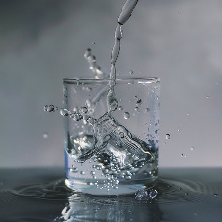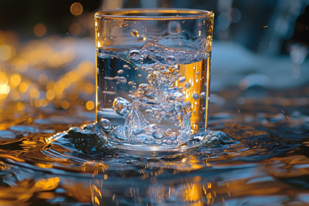 A stunning close-up of fresh water pouring into a glass, creating bubbles as it flows and reflecting light on a calm surface, symbolizing freshness and hydration.