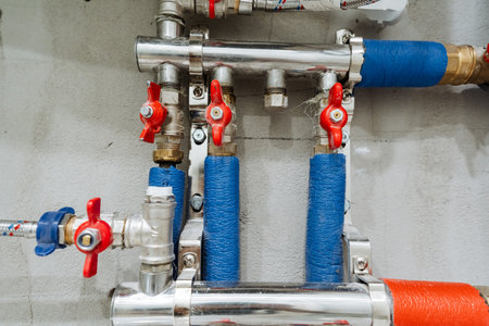 Close-up view of water heater pipes and valves in a utility room, featuring colorful connectors and tubes. Essential components for heating system maintenance and operation. Gas boiler taps.