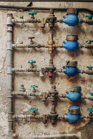 Water pipes with meters outside an old house in Italy