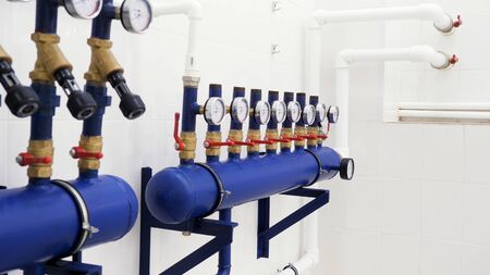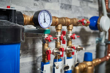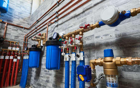 Plumbing service. pipeline with filtraters and leakage protecting equipmentin boiler room