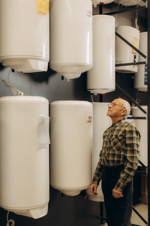 Senior man shopping for water heaters, looking up at different models in a home improvement and plumbing supply store