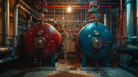 Two large water heaters are positioned against a teal wall, showing industrial plumbing in a vintage setting.