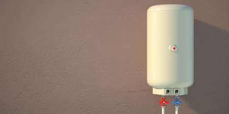 Electric water heater on brown color wall, copy space. Home wall mounted water heating boiler. 3d illustration