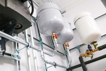 Plumbing service. stainless steel pipeline and expansion vessel of a heating system in boiler room
