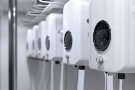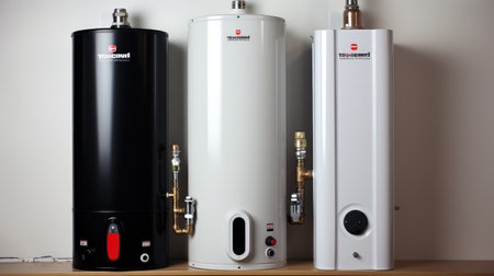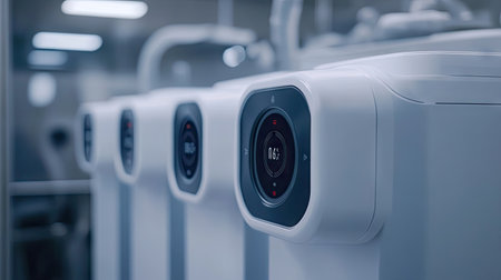 Several sleek white water heaters are arranged neatly in a contemporary utility space, ensuring hot water supply.