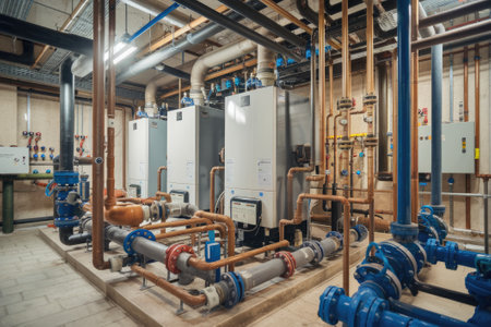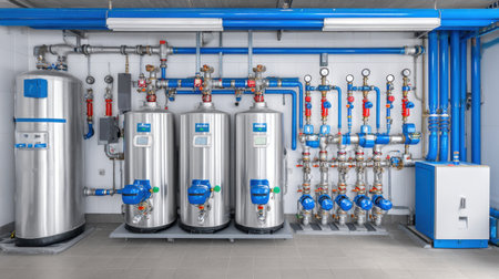 A detailed view of an industrial pipework system showing metallic pipes, red valves, and blue insulation, highlighting modern plumbing methods and advanced installation techniques