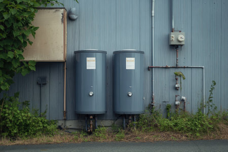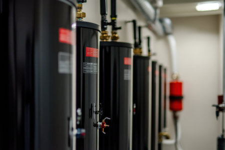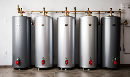 Metal water heaters are aligned in a commercial space, showing their functional design and purpose.