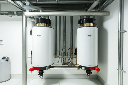 Two white boilers are installed side by side in a clean, well-lit technical space with pipes and valves visible.