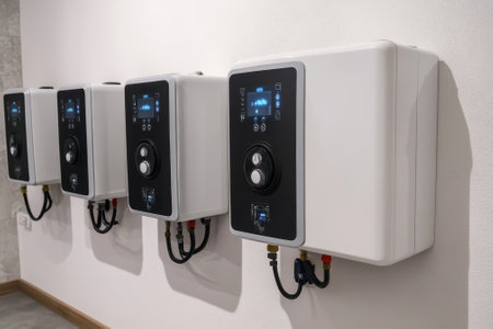Four sleek electric water heaters are mounted on a white wall in a modern, minimalist interior.