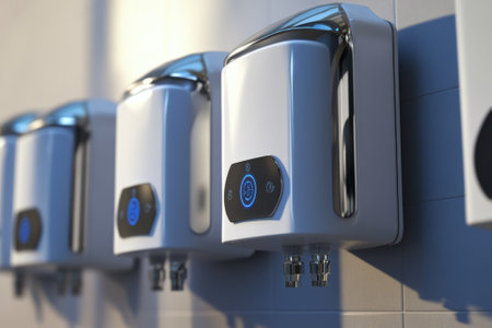 Advanced hand dryers are installed on a restroom wall, featuring a modern look and touchless operation.