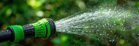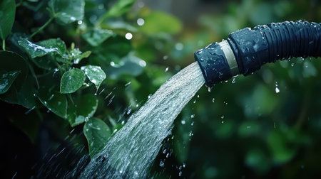 A detailed close-up image showcasing a garden hose sprayer releasing a fine water stream amidst vibrant green foliage, perfect for illustrating gardening themes.
