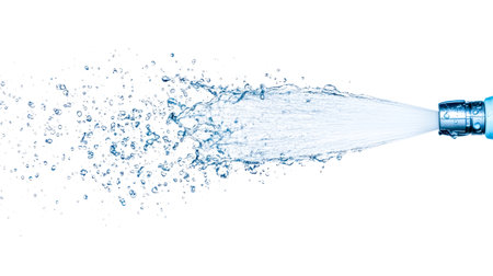 Water is spraying from a hose creating a powerful jet with droplets against a clean white background, offering a refreshing and dynamic visual