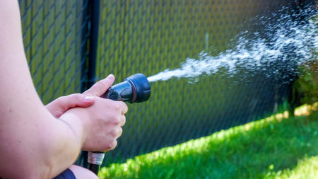 Individual grips a garden hose, spraying water onto lush green grass in a backyard setting, with a black fence visible behind