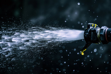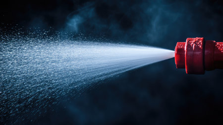 Close-up shot of a red hose nozzle releasing a high-pressure water spray with a dark backdrop, symbolizing industrial or firefighting equipment