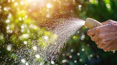 A vibrant scene showcasing a person's hand holding a garden hose, spraying water in sunlight. The playful droplets create a refreshing atmosphere in a lush garden, ideal for depicting the joy of gardening and outdoor maintenance.
