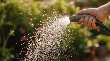 A gardener using a rubber hose to water plants, with water droplets suspended in the air, capturing the freshness of nature
