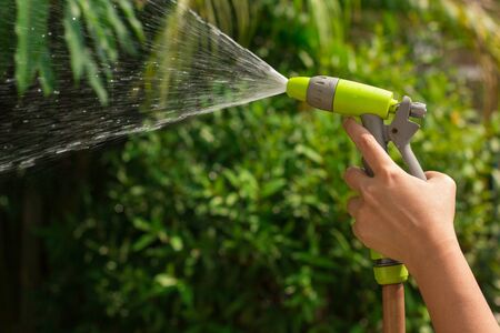 Woman hand holding garden hose with sprayer nozzle watering lawn