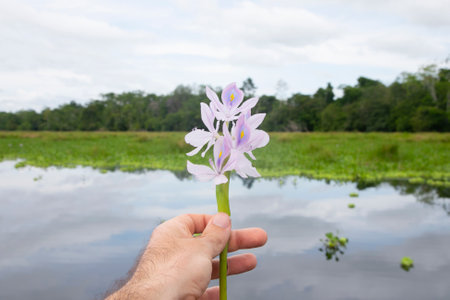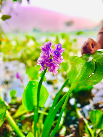 Close-up of water hyacinth flower, hand holding leaves. Bangladesh rural river side.
