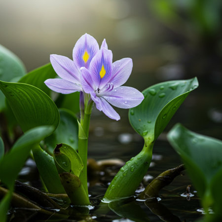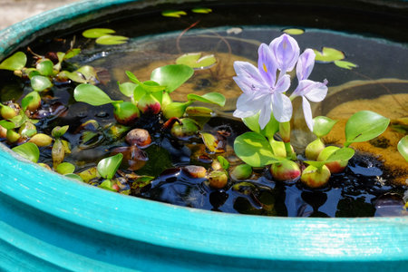 Beautiful purple flower of Common water hyacinth (Pontederia crassipes) with drops of water is growing among green leaves in the water garden in summer.