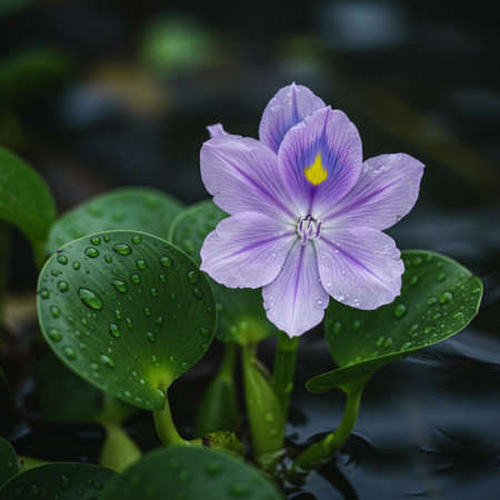 Purple water hyacinth flower with raindrops on dark background