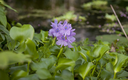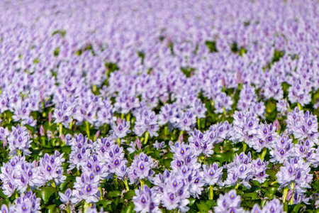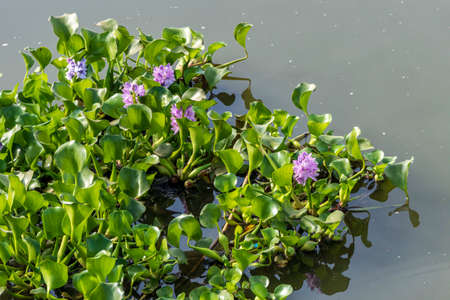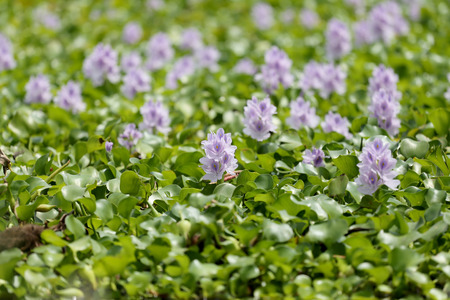 Flowering water hyacinth plants or Eichhornia crassipes that thrive in swamps with a blurred background