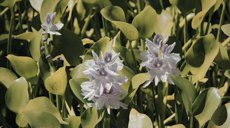 A closeup shot of aquatic plants, water hyacinth