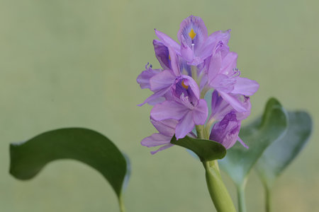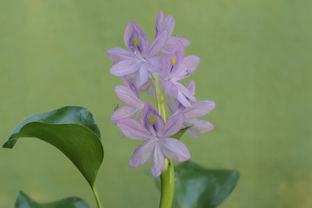 Water hyacinth flower with blurry green leaf in the background