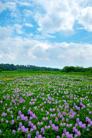 Beautiful Water Hyacinth flower field photography, Paddy field filled with Water Hyacinth flowers under a blue and white cloudy sky Kerala