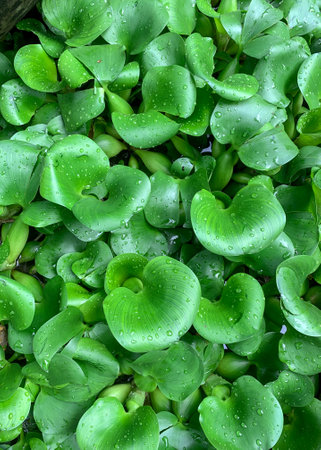 Beautiful water hyacinth leaf pattern, close up. Top view. Copy space. Wallpaper background.