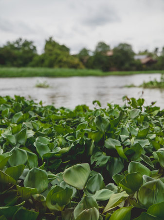 Water hyacinths float gracefully on a calm river, surrounded by vibrant greenery, creating a serene natural scene. Perfect for showcasing aquatic plant life.