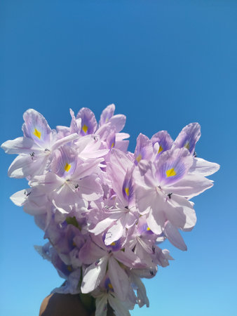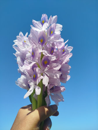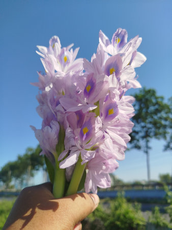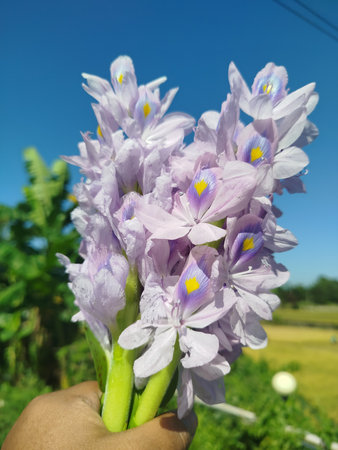 water hyacinth flower in hand with blue sky background, soft focus