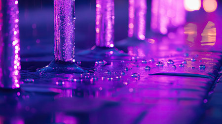 Beautiful purple water cascades under urban lights at night, creating a serene and aesthetic atmosphere. Reflections shimmer on the wet surface, enhancing the visual depth.