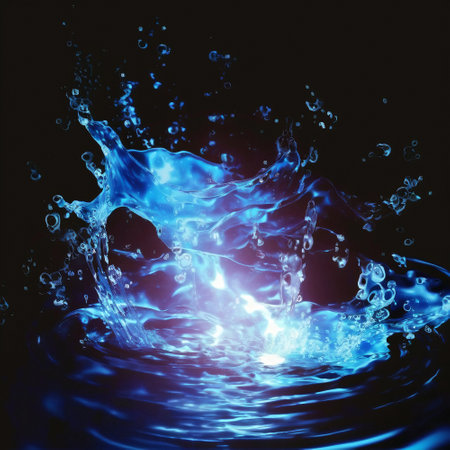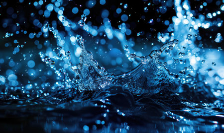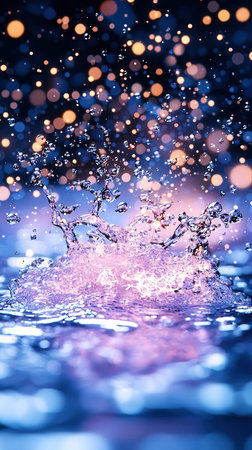 A stunning shot of a water splash captured mid-motion, with bokeh effects and colorful blue and pink lighting, creating a magical atmosphere.