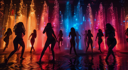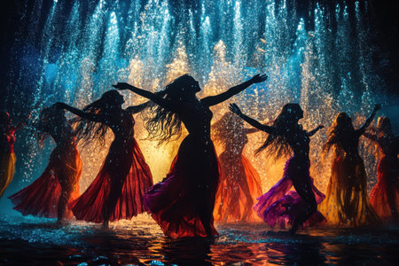 The dancers move elegantly in intricate gowns as water splashes brilliantly behind them, creating a magical atmosphere.