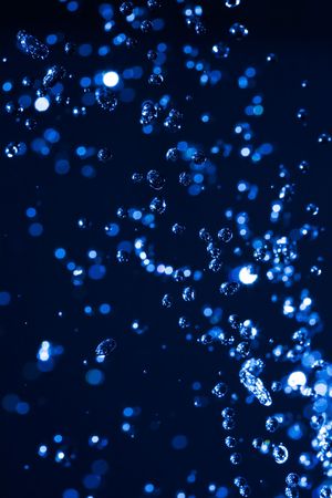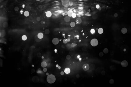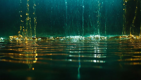 A serene and peaceful scene of water droplets falling into a blue body of water at night, creating a soothing ambiance with a dark background and bokeh lights.