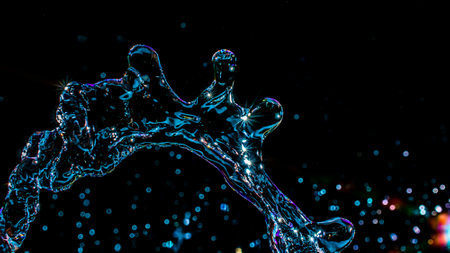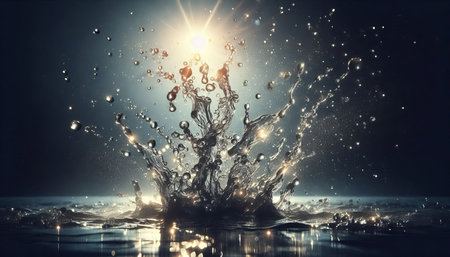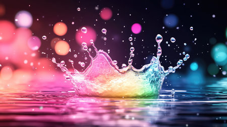 Water droplets burst into colorful splashes against a dark backdrop, creating a mesmerizing display of light and movement, evoking energy and dynamism.