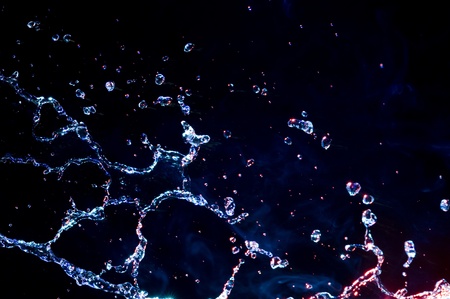 A vibrant water splash in motion with red and blue colors against a dark background, illuminated by bokeh light effects creating a dramatic, dynamic scene.