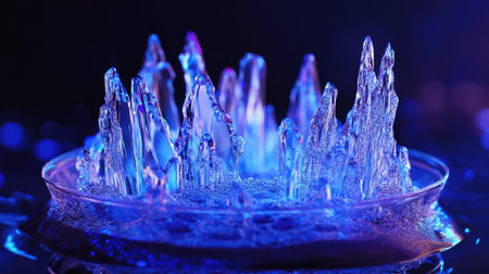 A dynamic shot of water splashing in a clear glass, illuminated with vibrant blue lighting and bokeh effects, creating a refreshing and energetic scene.