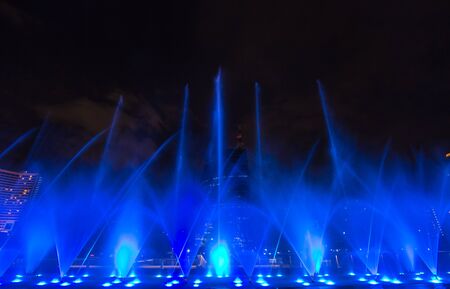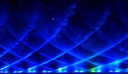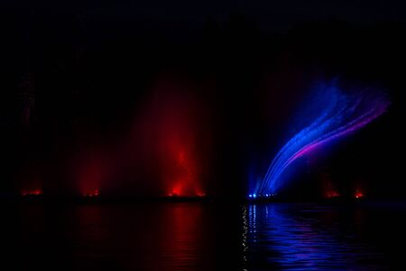 Colorful water fountains. Beautiful laser and fountain show. Large multi colored decorative dancing water jet led light fountain show at night. Dark background.