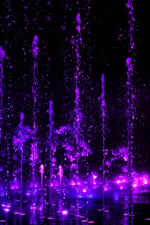 Splashes of fountain. Water illuminated in colorful falling on fountain which change it water color in night. Wonderful multicolored fountain throws up high streams of sparkling water.