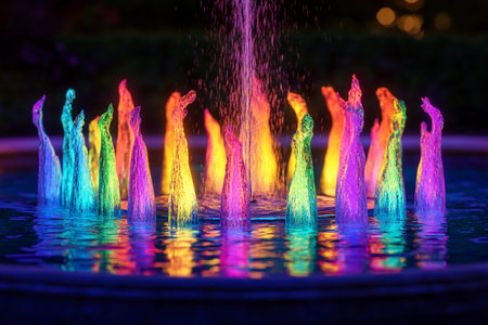 A vivid water fountain bursts to life with colorful lights at night, creating a mesmerizing display that enhances the tranquil outdoor environment.