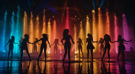 Silhouettes of dancers are illuminated by colorful fountains, creating a vibrant performance against the backdrop of a cityscape at night.