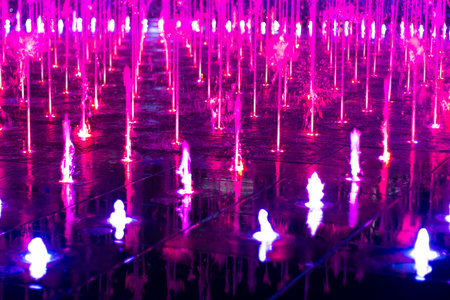 Splashes of colorful fountain. Water illuminated in diverse colors falling on a fountain which change its water color in the night.