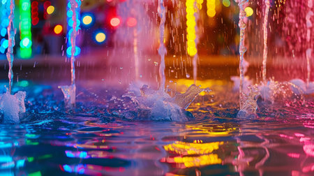 Stunning close-up of vibrant water fountains illuminated at night, showcasing droplets and splashes against a colorful bokeh background for an enchanting visual experience.